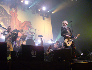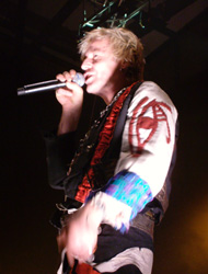Leinwand. Mit einem lauten Knall und viel Funkenflug viel das Tuch zu Boden. Sänger und Frontman,